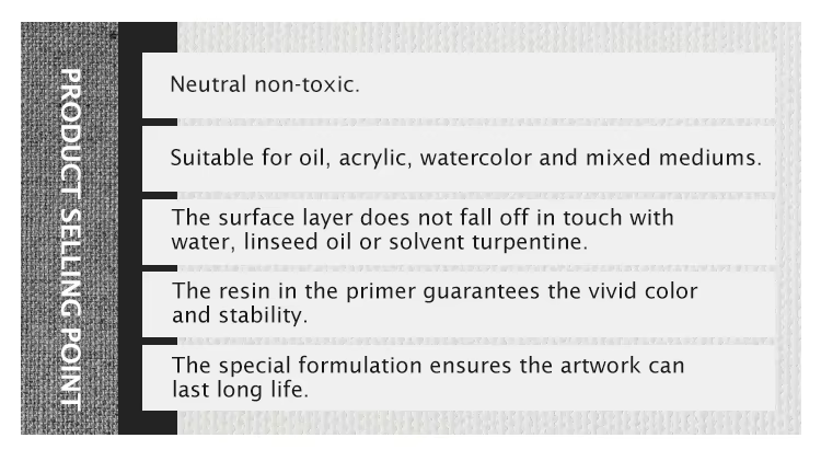●ประสิทธิภาพสี:สัมผัสกับสีที่แท้จริงกับชีวิตบนผืนผ้าใบศิลปะของเรา การเคลือบที่ปราศจากกรดช่วยป้องกันสีเหลืองในขณะที่รักษาความสมบูรณ์ของเม็ดสีมานานกว่า 50 ปี เมื่อเทียบกับผืนผ้าใบธรรมดาเราแสดงความลึกสีที่สมบูรณ์ยิ่งขึ้น 20% ในการทดสอบในห้องปฏิบัติการ